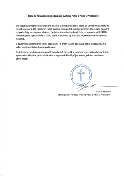 Rádi bychom společnost doporučili i do dalších farností, a to především z důvodu kvalitního zpracování nábytku, jeho odolnosti a v neposlední řadě příjemnému jednání s vedením společnosti.
