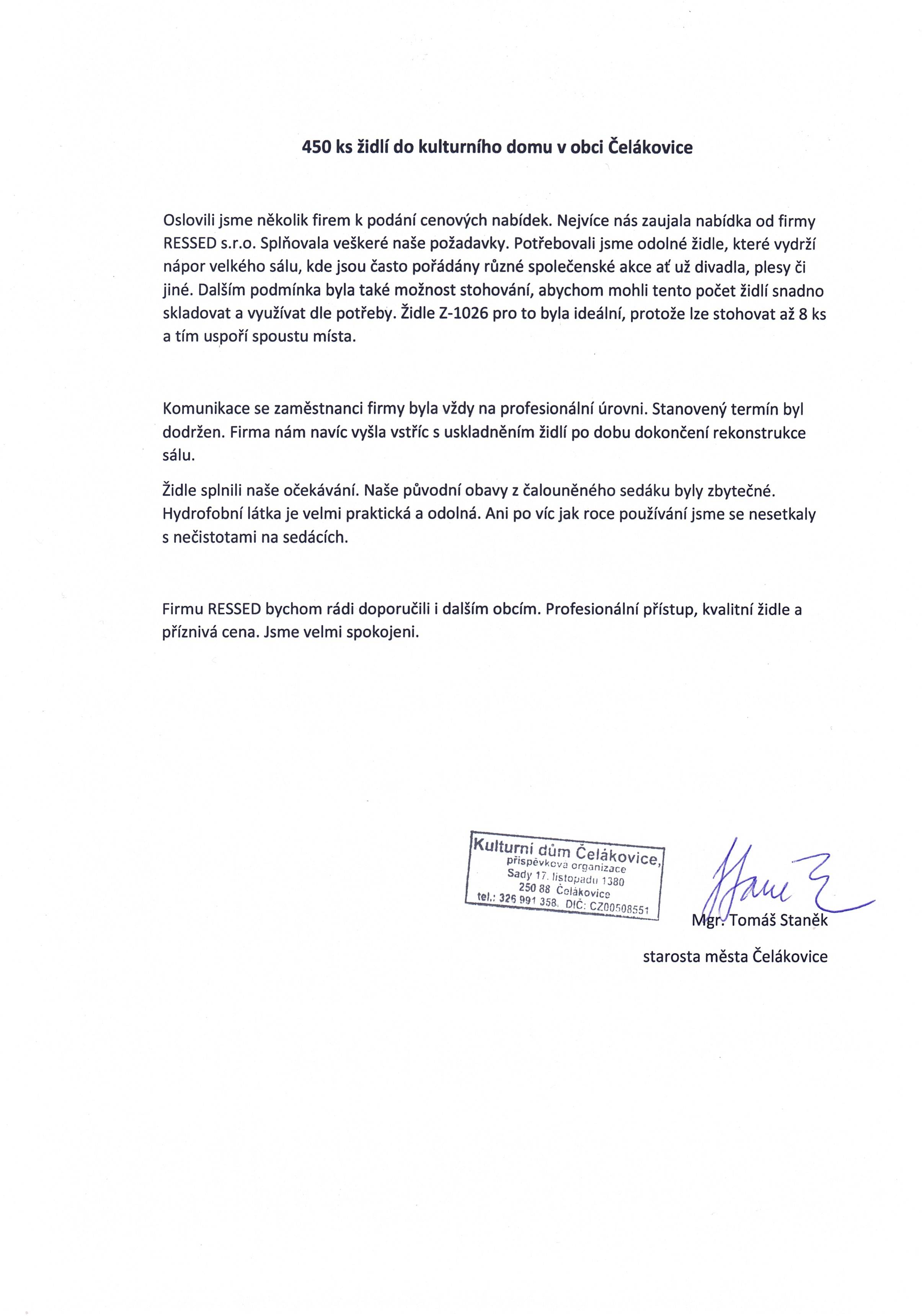 Firmu RESSED bychom rádi doporučili i dalším obcím. Profesionální přístup, kvalitní židle a příznivá cena. Jsme velmi spokojeni.