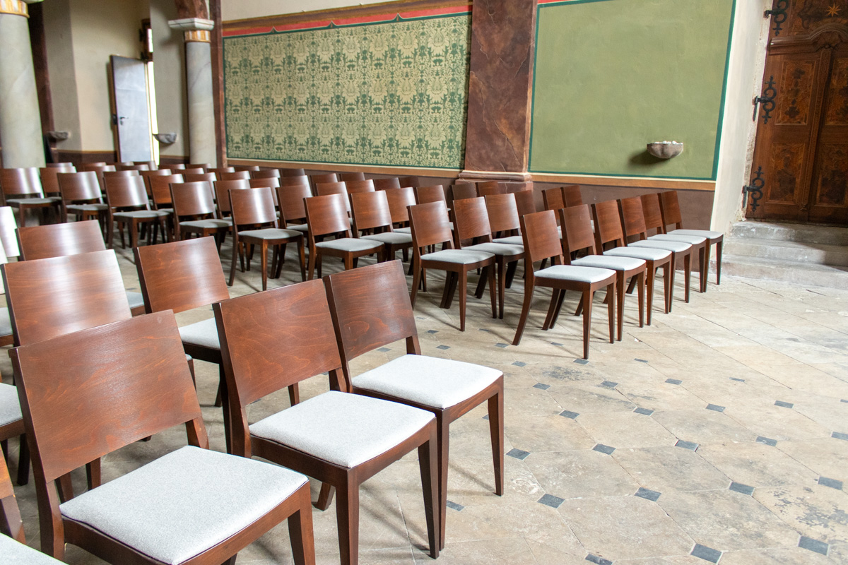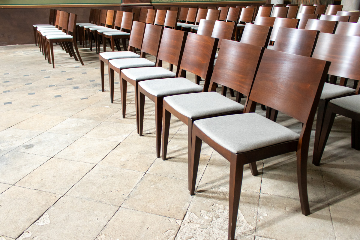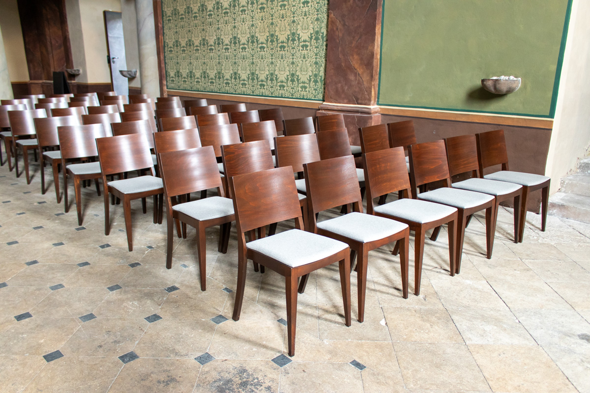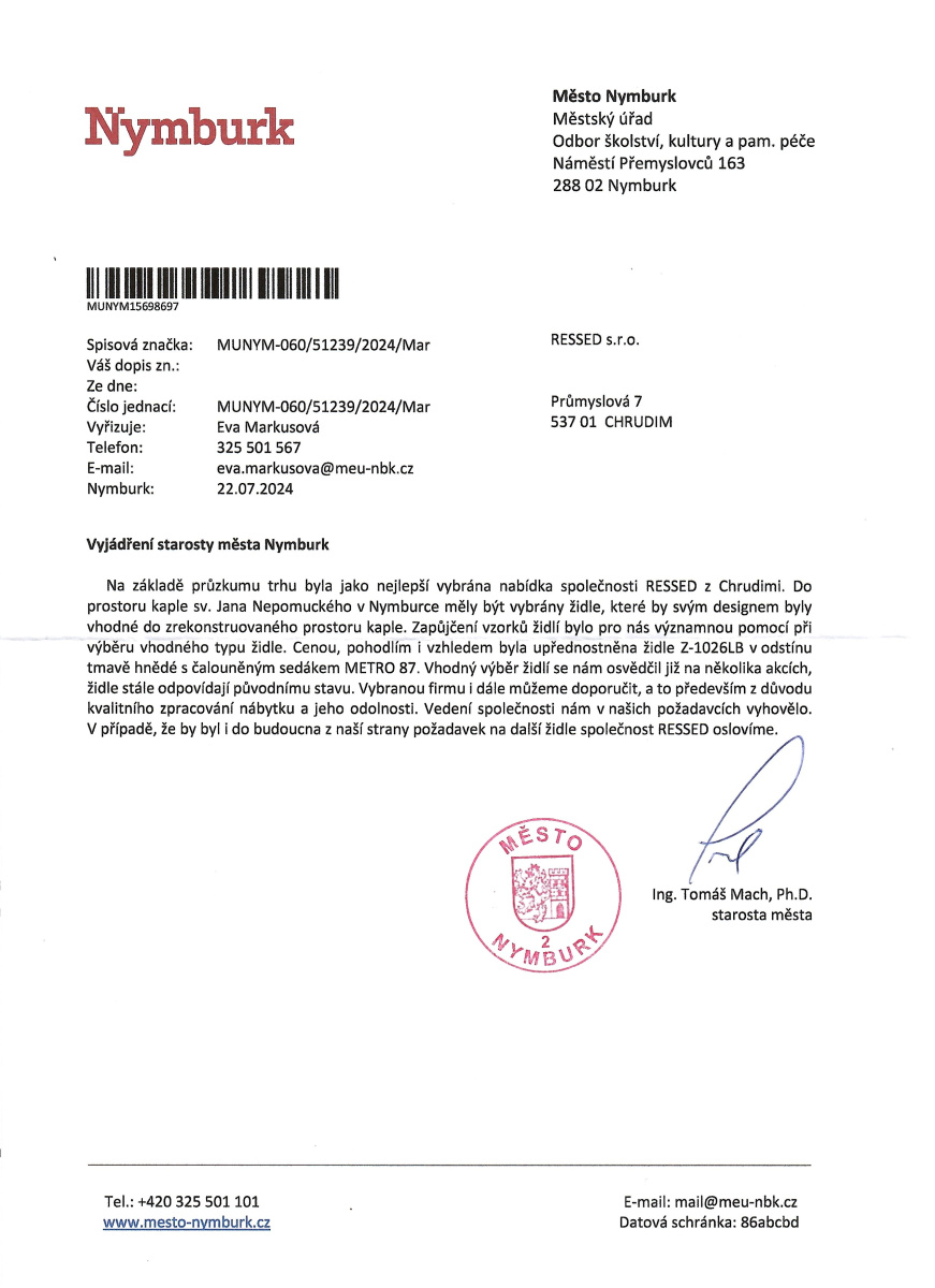 Na základě průzkumu trhu byla jako nejlepší vybrána nabídka společnosti RESSED z Chrudimi. Do prostoru kaple sv. Jana Nepomuckého v Nymburce měly být vybrány židle, které by svým designem byly vhodné do zrekonstruovaného prostoru kaple. Zapůjčení vzorků židlí bylo pro nás významnou pomocí při výběru vhodného typu židle. Cenou, pohodlím i vzhledem byla upřednostněna židle Z-1026LB v odstínu tmavě hnědé s čalouněným sedákem METRO 87.