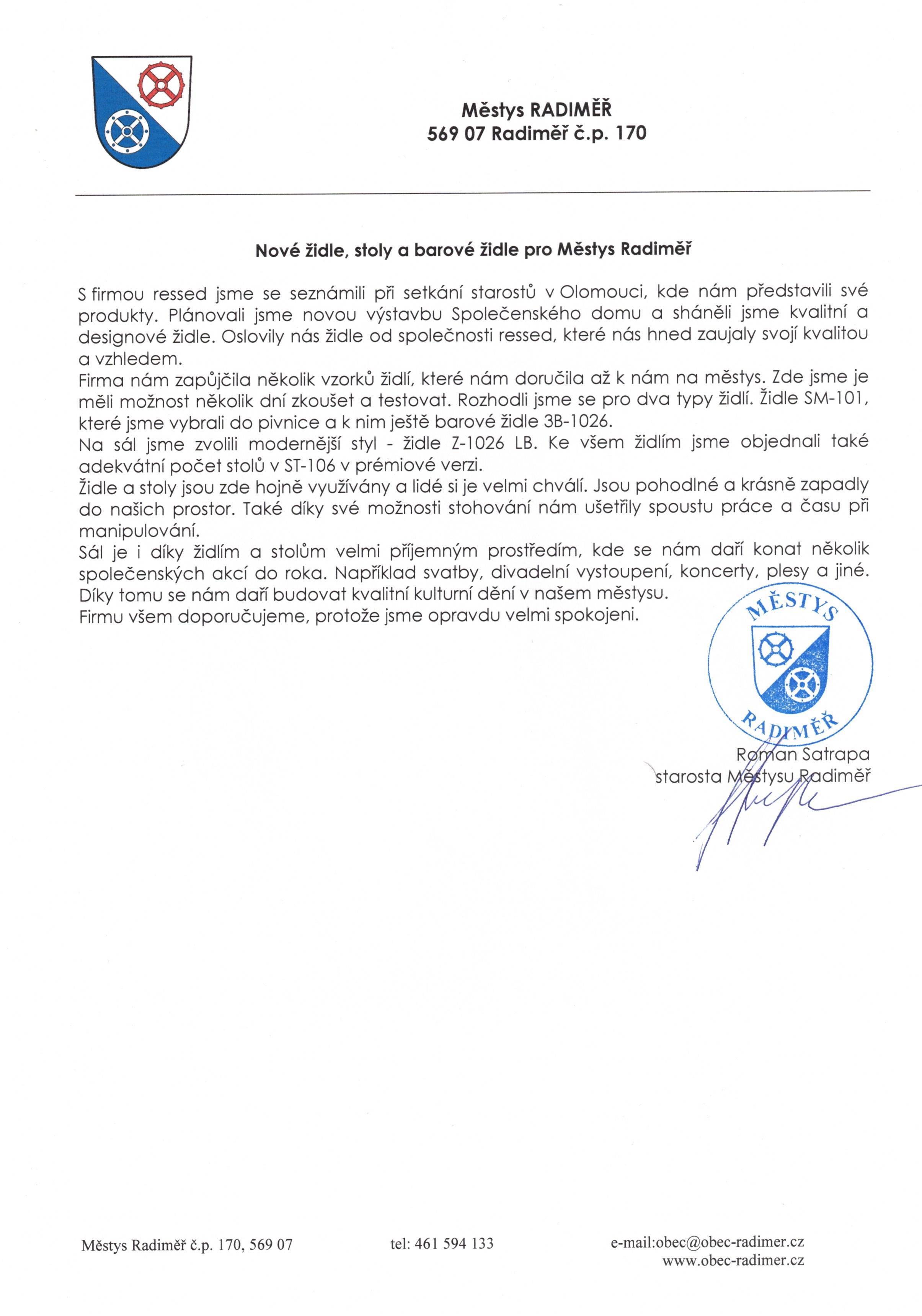 S firmou RESSED jsme se seznámili při setkání starostů v Olomouci, kde nám představili své produkty. Plánovali jsme novou výstavbu společenského domu a sháněli jsme kvalitní a designové židle. Oslovily nás židle od společnosti RESSED, které nás hned zaujaly svou kvalitou a vzhledem.