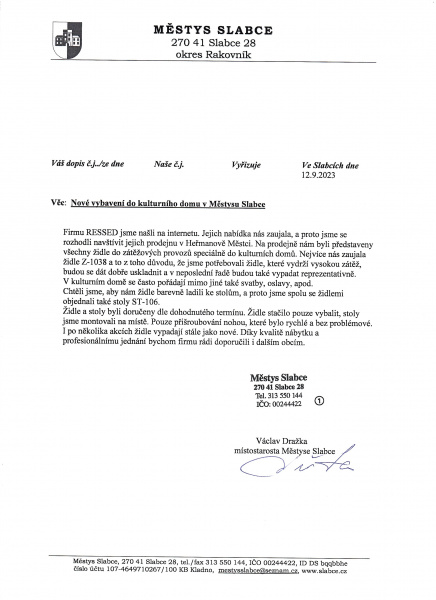 Firmu RESSED jsme našli na internetu. Jejich nabídka nás zaujala, a proto jsme se rozhodli navštívit jejich prodejnu v Kočí. Na prodejně nám byly představeny všechny židle do zátěžových provozů, speciálně do kulturních domů. Nejvíce nás zaujala židle Z-1038 a to z toho důvodu, že jsme potřebovali židle, které vydrží vysokou zátěž, budou se dát dobře uskladnit a v neposlední řadě budou také vypadat reprezentativně. V kulturním domě se často pořádají mimo jiné také svatby, oslavy apod. Chtěli jsme, aby nám židle barevně ladili ke stolům, a proto jsme spolu se židlemi objednali také stoly ST-106.