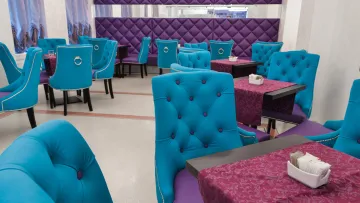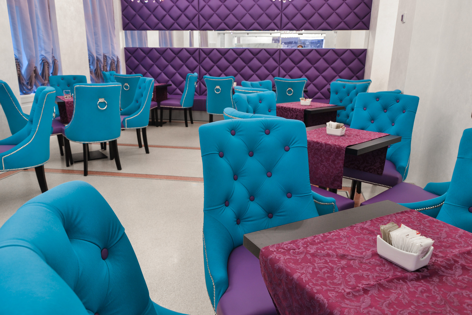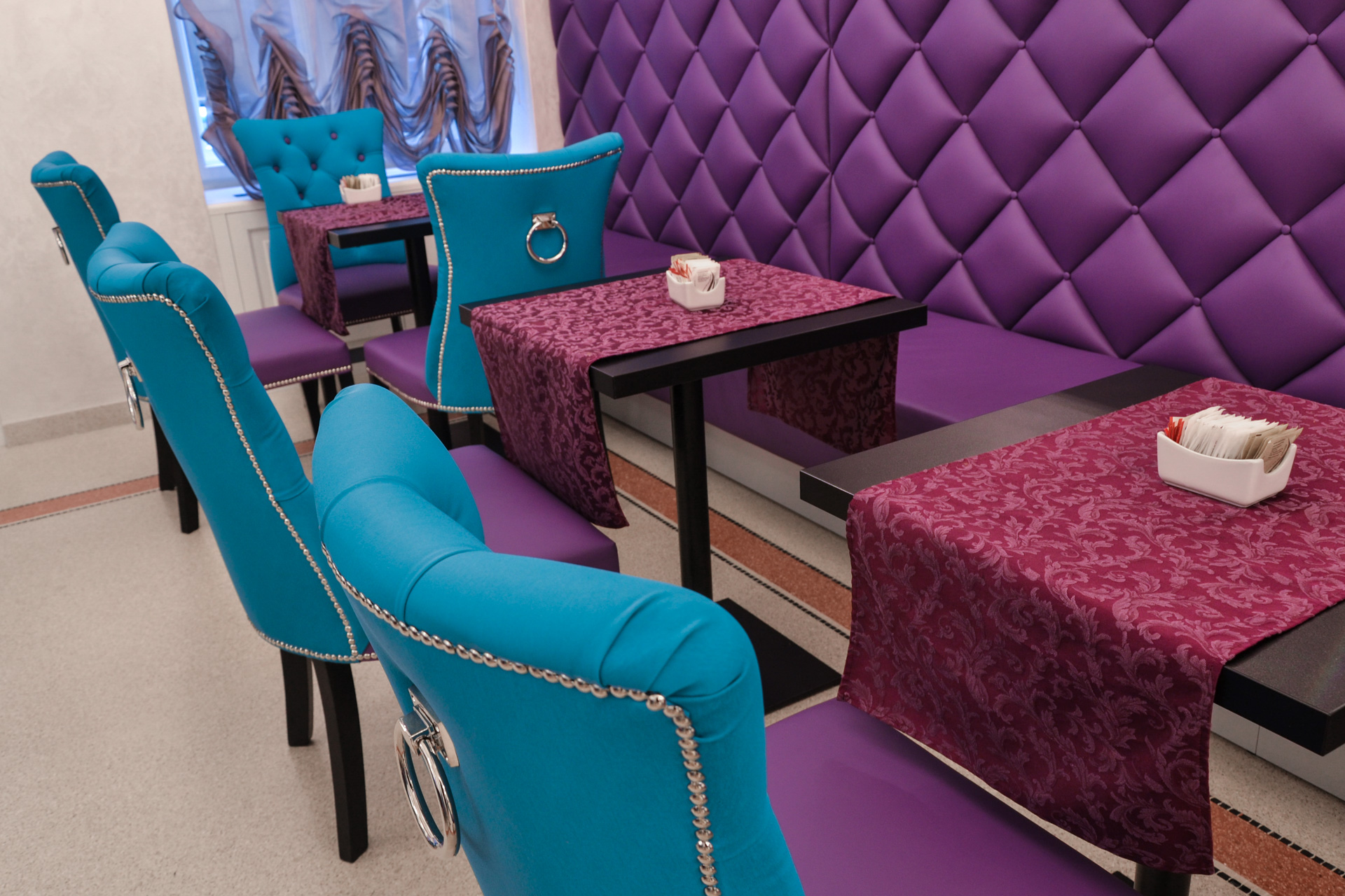Bylo nutné designově sjednotit veškerý sedací nábytek v celém luxusním hotelu. Jak barevně, tak tvary a stylem. Převážnou část tvoří fialové a modré čalounění, prošívání opěradel v anglickém stylu chesterfield a luxusní zdobení připínáčky spolu s klepadly (madly) na zadní straně opěradel. V jídelní části jsme obsadili oblíbené židle Lady Sir England a Asher. K nim doladili jídelní stoly a lavici na míru. Dominantou je čalouněná stěna se zrcadly. Lobby bar zdobí barová židle Lady. Do pokojů se použil decentnější sedací nábytek. Vysoká židle Comforta a k ní ve stejném designu křesílko. Pro chvíle odpočinku mají hosté k dispozici i křeslo ušák.