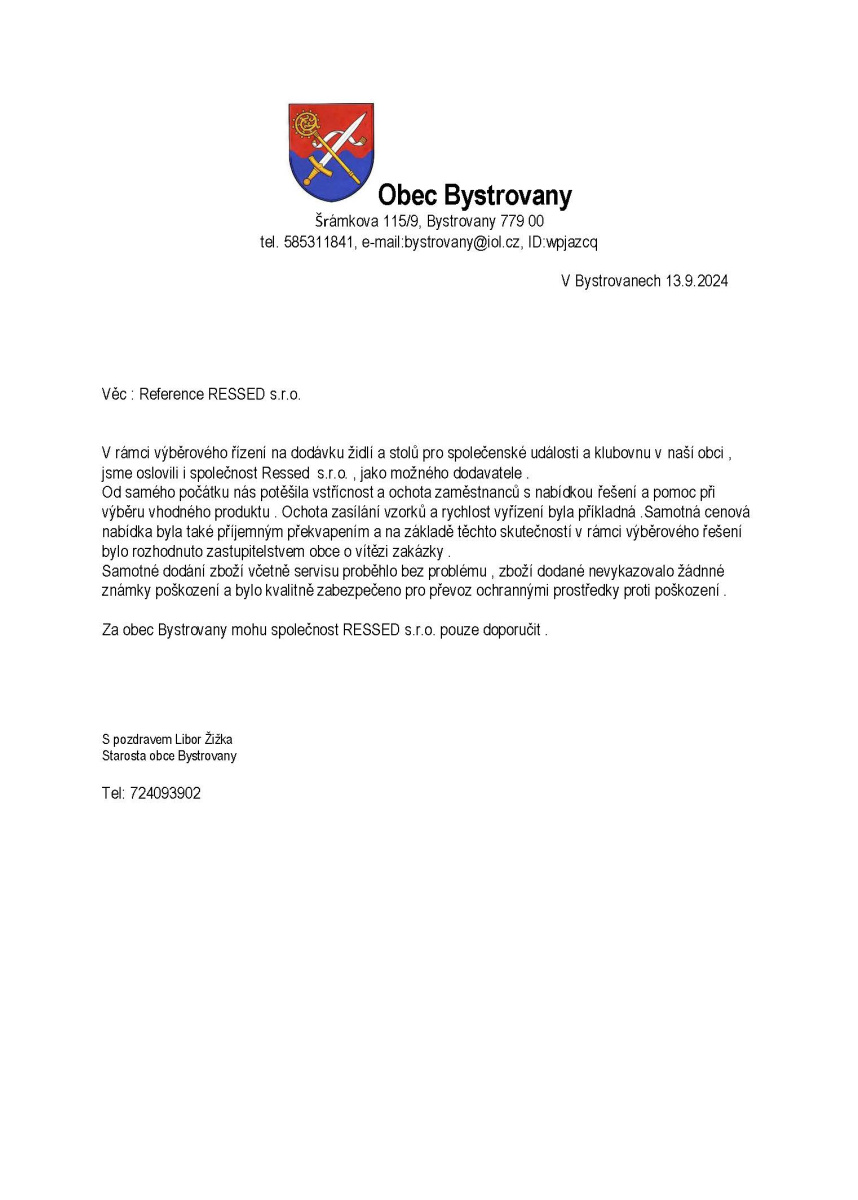 V rámci výběrového řízení na dodávku židlí a stolů pro společenské události a klubovnu v naší obci, jsme oslovili i společnost RESSED s.r.o., jako možného dodavatele.