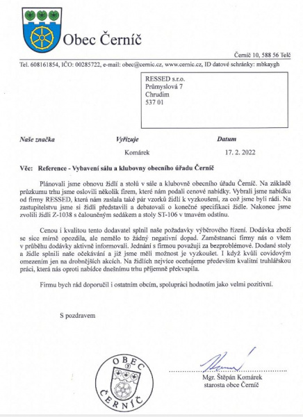 Plánovali jsme obnovu židlí a stolů v sále a klubovně obecního úřadu Černíč. Na základě průzkumu trhu jsme oslovili několik firem, které nám podali cenové nabídky. Vybrali jsme nabídku od firmy RESSED, která nám zaslala také pár vzorků židlí k vyzkoušení, za což jsme byli rádi. Na zastupitelstvu jsme si židli představili a debatovali o konečné specifikaci židle. Nakonec jsme zvolili židli Z-1038 s čalouněným sedákem a stoly ST-106 v tmavém odstínu.