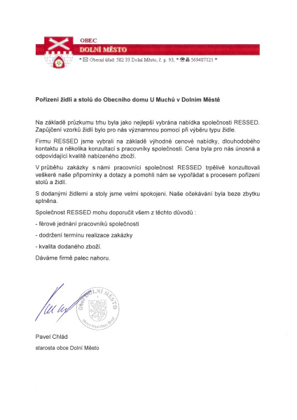 Firmu RESSED jsme vybrali na základě výhodné cenové nabídky, dlouhodobého kontaktu a několika konzultaci s pracovníky společnosti. Cena byla pro nás únosná a odpovídající kvalitě nabízeného zboží.