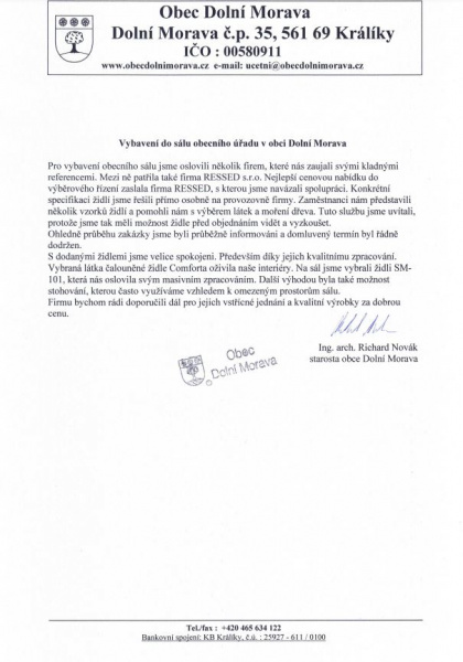 Pro vybavení obecního sálu jsme oslovili několik firem, které nás zaujali svými kladnými referencemi. Mezi ně patřila také firma RESSED s.r.o. Nejlepší cenovou nabídku do výběrového řízení zaslala firma RESSED, s kterou jsme navázali spolupráci. Konkrétní specifikaci židlí jsme řešili přímo osobně na provozovně firmy. Zaměstnanci nám představili několik vzorků židlí a pomohli nám s výběrem látek a moření dřeva. Tuto službu jsme uvítali, protože jsme tak měli možnost židle před objednáním vidět a vyzkoušet.