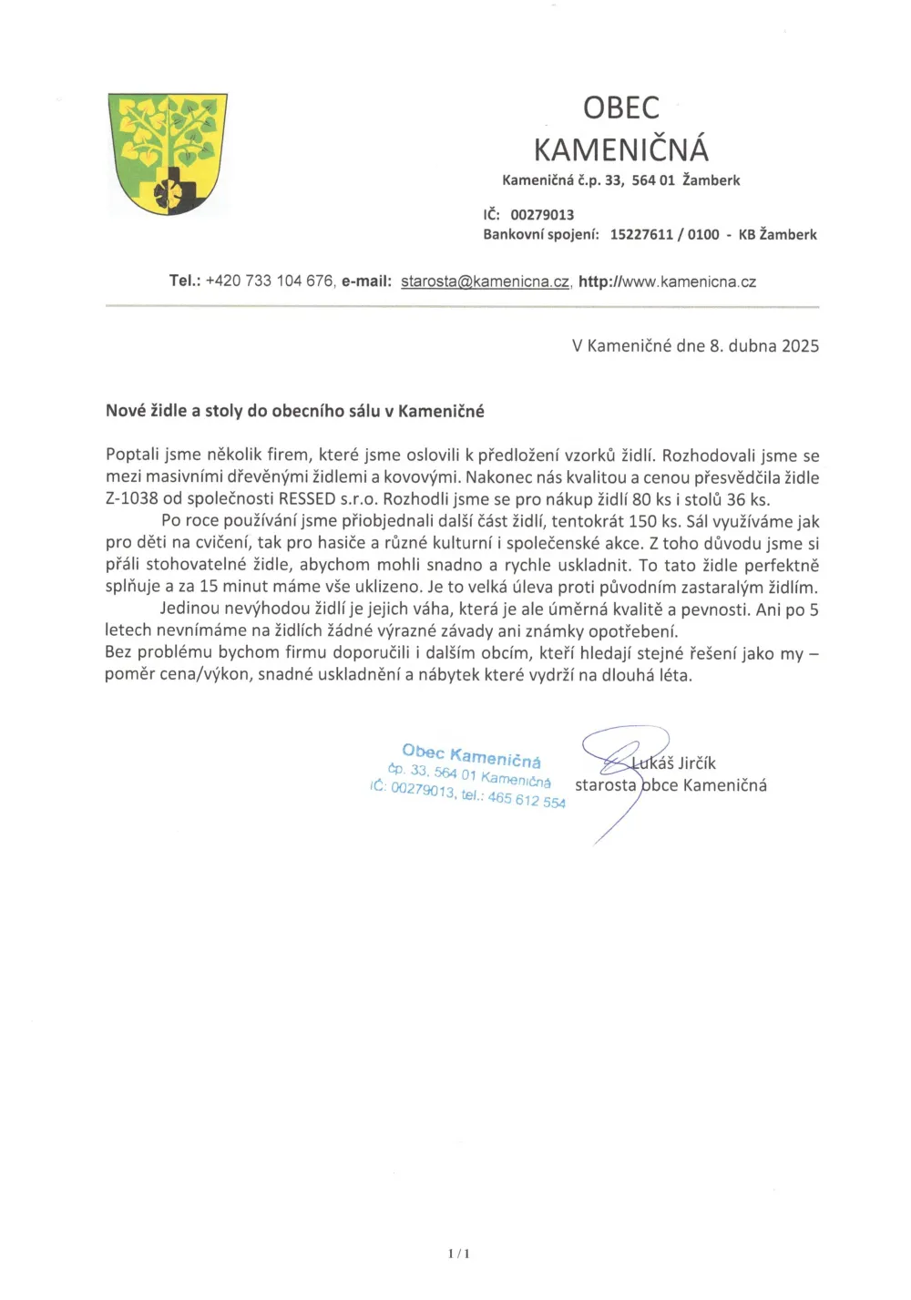 Bez problému bychom firmu doporučili i dalším obcím, kteří hledají stejné řešení jako my – poměr cena/výkon, snadné uskladnění a nábytek které vydrží dlouhá léta.