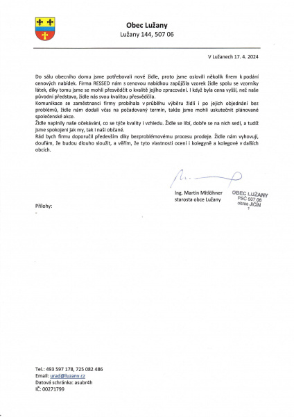 Rád bych firmu doporučil především díky bezproblémovému procesu prodeje. Židle nám vyhovují, doufám, že budou dlouho sloužit, a věřím, že tyto vlastnosti ocení i kolegyně a kolegové v dalších obcích.