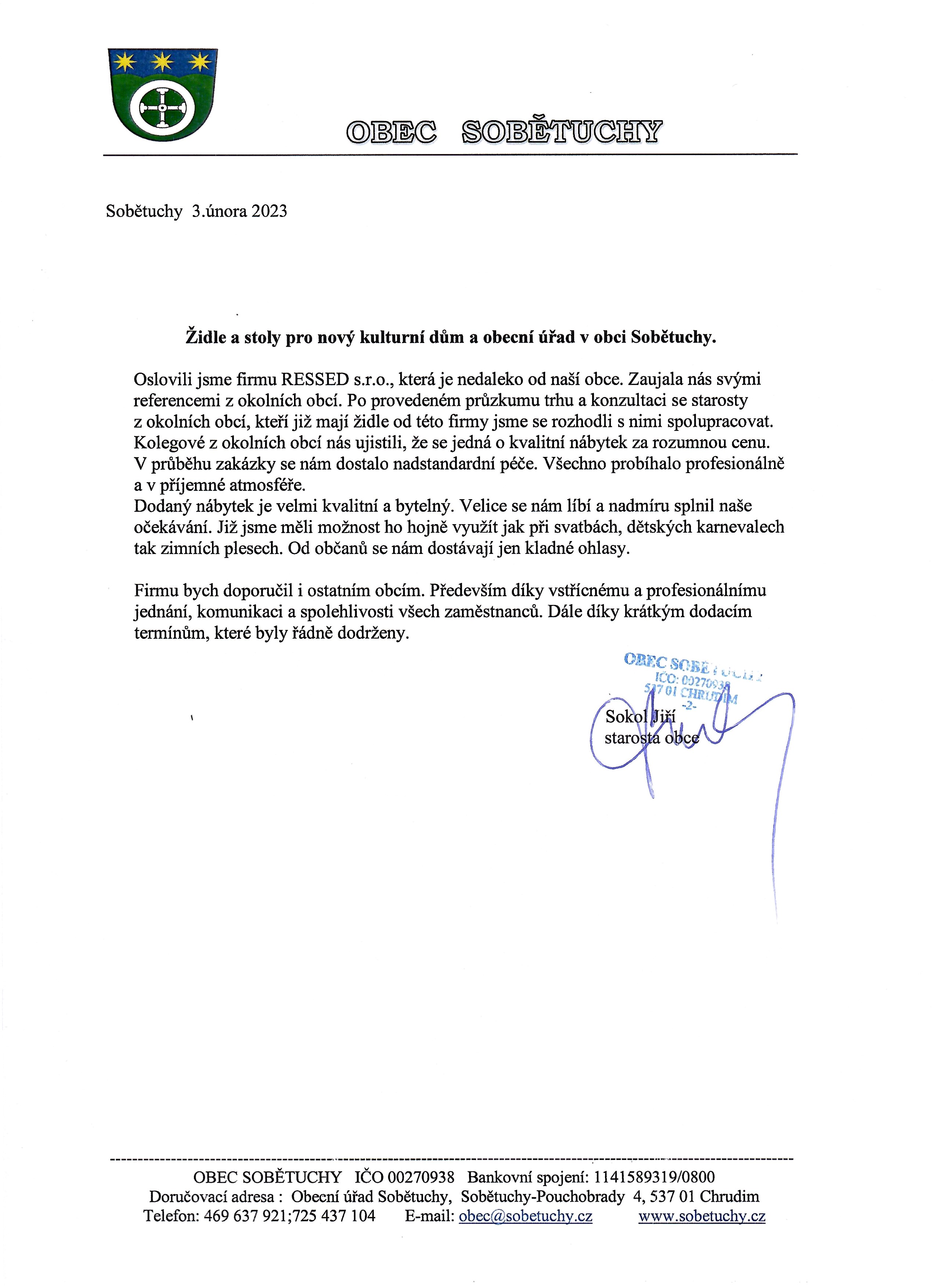 "Oslovili jsme firmu RESSED s.r.o., která je nedaleko od naší obce. Zaujala nás svými referencemi z okolních obcí. Po provedeném průzkumu trhu a konzultaci se starosty z okolních obcí, kteří již mají židle od této firmy, jsme se rozhodli s nimi spolupracovat. Kolegové z okolních obcí nás ujistili, že se jedná o kvalitní nábytek za rozumnou cenu. V průběhu zakázky se nám dostalo nadstandardní péče. Vše probíhalo profesionálně a v příjemné atmosféře. Dodaný nábytek je velmi kvalitní a bytelný. Velice se nám líbí a nadmíru splnil naše očekávání. Již jsme měli možnost ho hojně využívat jak při svatbách, dětských karnevalech, tak zimních plesech. Od občanů se nám dostávají jen kladné ohlasy. Firmu bych doporučil i ostatním obcím. Především díky vstřícnému a profesionálnímu jednání, komunikaci a spolehlivosti všech zaměstnanců. Dále díky krátkým dodacím termínům, které byly řádně dodrženy."