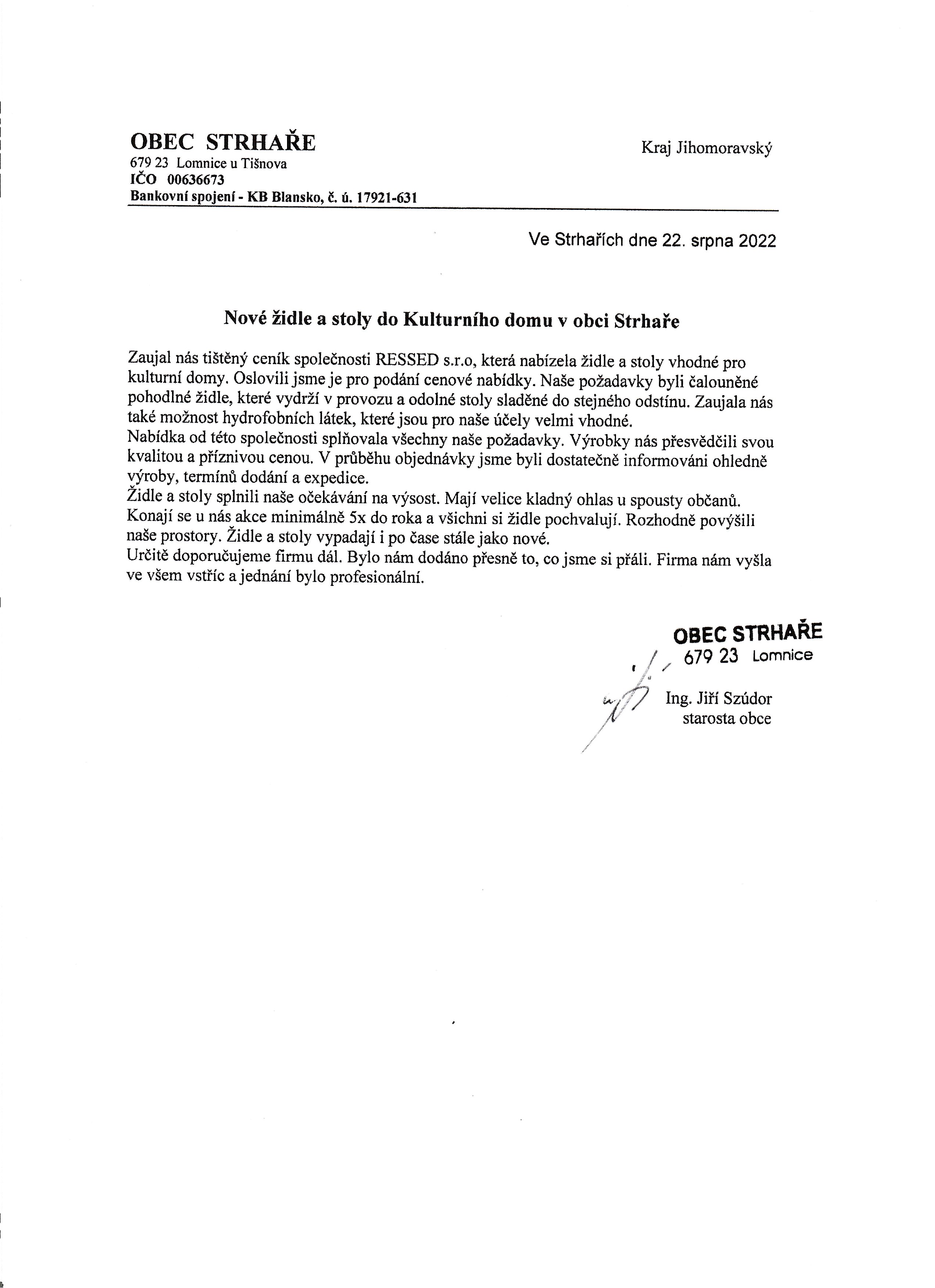 Židle a stoly splnily naše očekávání na výsost. Mají velice kladný ohlas u spousty občanů. Konají se u nás akce minimálně 5x do roka a všichni si židle pochvalují. Rozhodně povýšily naše prostory. Židle a stoly vypadají i po čase stále jako nové.